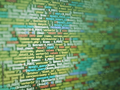 Green unique background. Programming PHP on laptop computer screen. Program code PHP HTML CSS of site. Template of website, selective focus.