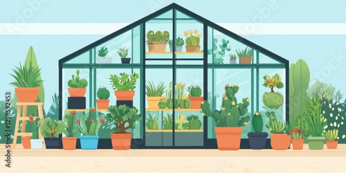 Greenhouse filled with various potted plants and vibrant greenery in a sunny garden setting