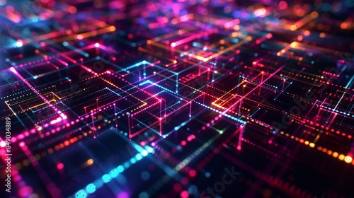 Grid of geometric lines, dark background, vibrant highlights, neon glow, bold and futuristic style.