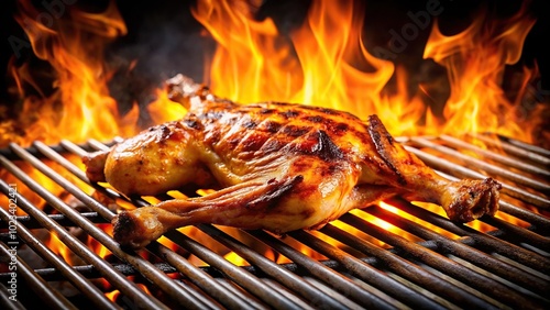 Grilled chicken on a grill with flames