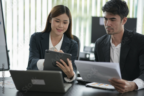 Group of asian business people working, discussing new projects together, having fun at the office.