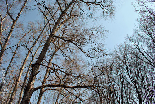 Group of aspen trees brown trunks and branches without leaves on blue spring sky background, view from ground, horizontal