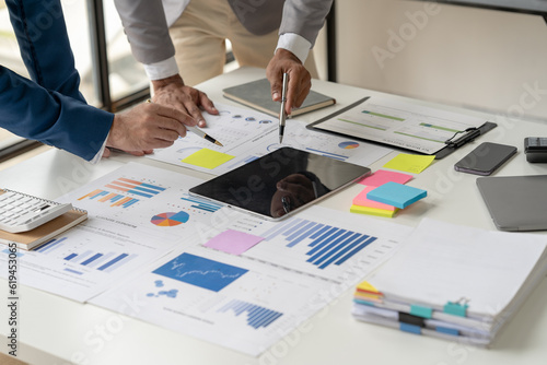 Group of business people meeting to plan, think, analyze, point to graph and business growth to plan new business expansion in the future using a laptop and a calculator.
