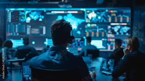 group of security professionals monitors multiple screens in dark room, analyzing data and responding to potential threats. atmosphere is focused and intense, showcasing teamwork and technology