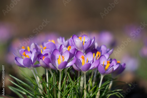 Group purple crocuses. Spring landscape.