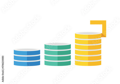 Growing stacks of colorful data disks or coins showing progress and achievement.