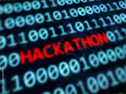 Hackathon red text between blue binary data on pixels screen 3D rendered with depth of field