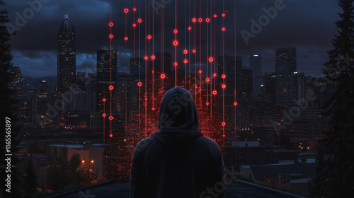 Hacker are planning to hack and attack networks and cyber security systems. Smart Innovation city with connection future wireless digital city and social media networking over the cityscape.