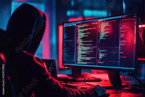 Hacker coding on computer at night. Cybercrime, virtual reality, information technology development. A man creating virus program for attacking and data theft