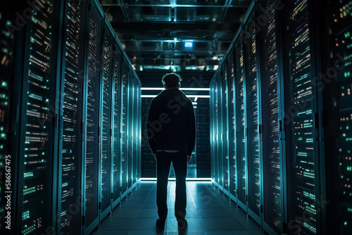 Hacker criminal standing in a tech room. Generative AI illustration