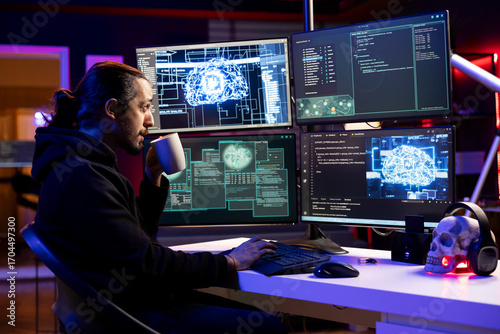 Hacker drinking coffee, installing spyware with AI to secretly gather data about user activity. Rogue engineer enjoying beverage, coding exploits using deep learning to gain unauthorized access
