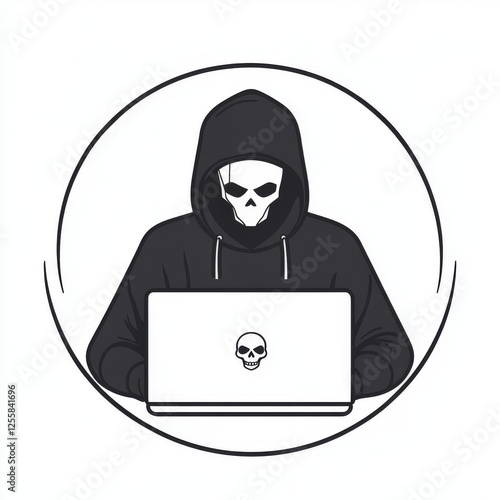 Hacker in Black Hoodie Flat Vector Icon on Laptop with Cyber Skull Background