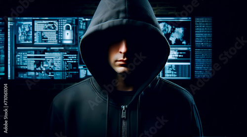 Hacker in hoodie dark theme cybersecurity vulnerability and hacker,coding,malware concept. Generative Ai.