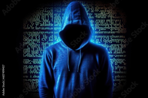 Hacker in hoodie dark theme Hacker in a blue hoody standing in front of a coding background with binary streams and information security terms cybersecurity concept Generated with AI.