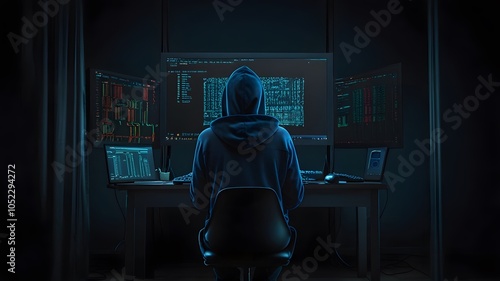 hacker intently working on code, surrounded by dimly lit screens in a dark room .