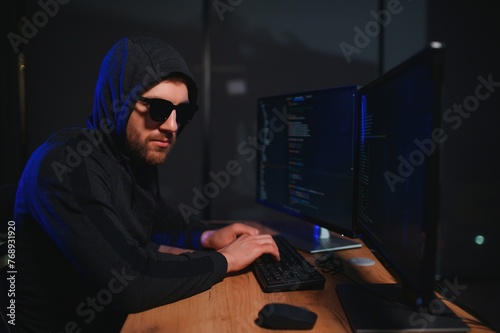 Hacker is hacking into the computer network. Computer criminal