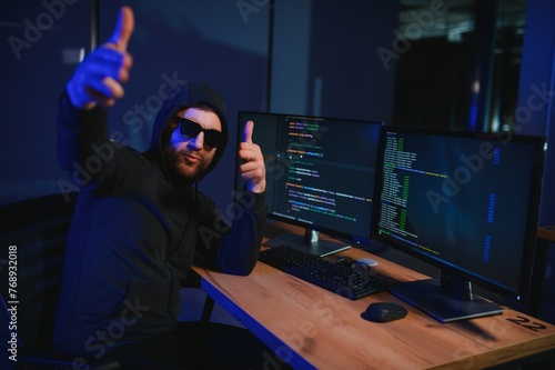 Hacker is hacking into the computer network. Computer criminal