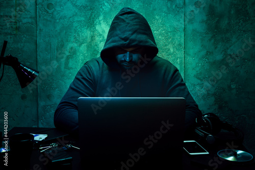 Hacker programmer using computer in dark room