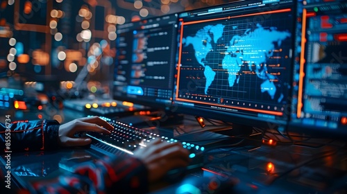 Hacker s Complex Digital Workspace with Code and Global Map Visualization