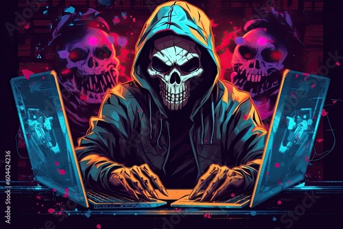hacker stealing data . Anonymous robot hacker with skull mask typing computer laptop. Concept of hacking cybersecurity, cybercrime, cyberattack