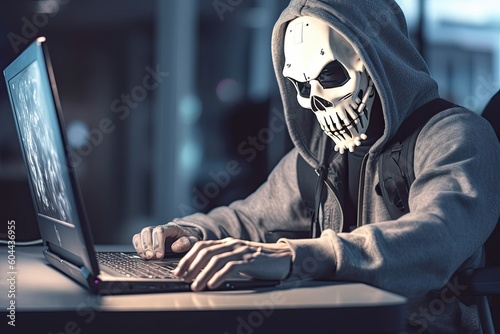 hacker stealing data . Anonymous robot hacker with skull mask typing computer laptop. Concept of hacking cybersecurity, cybercrime, cyberattack