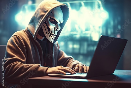 hacker stealing data . Anonymous robot hacker with skull mask typing computer laptop. Concept of hacking cybersecurity, cybercrime, cyberattack