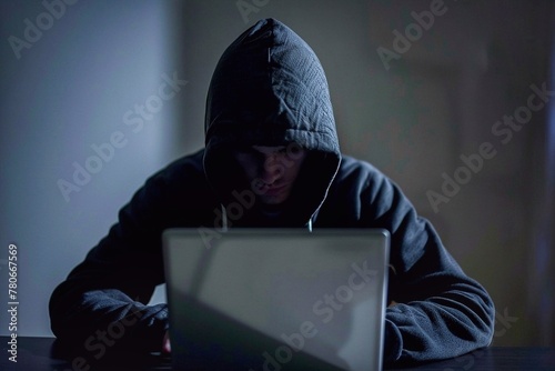 Hacker stealing data from laptop. Hooded man using laptop computer while sitting at table in dark room