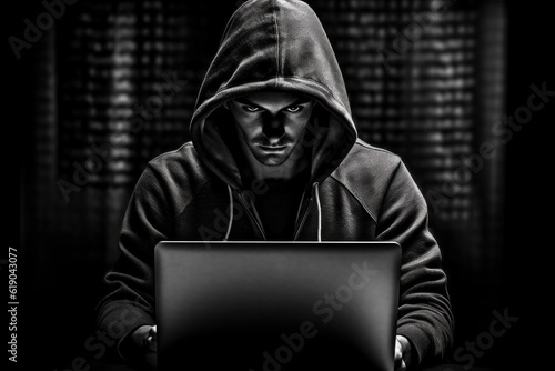 Hacker using laptop with binary code digital interface for hacking and deploy malware virus to others networks, Generative AI