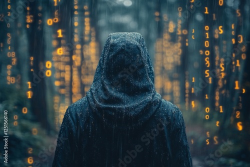 Hacker walking in rainy forest while binary code is falling, concept of cybersecurity and hacking