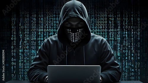 Hacker wearing a black jacket SQL injection on binary background encryption spyware