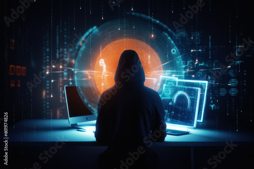 Hacking and Cyber security network and global networking with biometrics identity and blockchain protection. Ai generative.