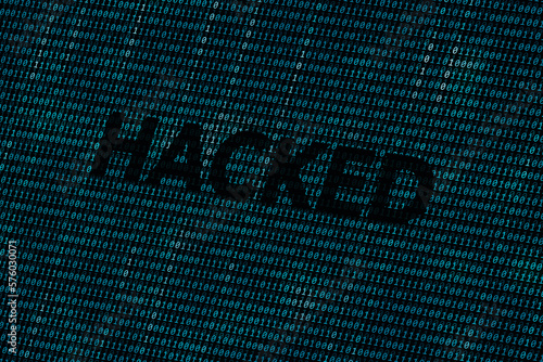 Hacking system alert concept. Hacked software and cyber security problem. Black hacker word over a binary code texture in perspective.