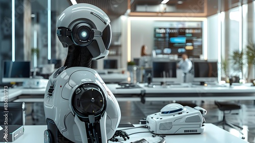 Half-Robot Half-Human Working in a Modern Office with Advanced Devices