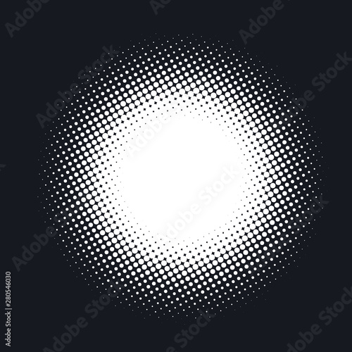 Halftone dotted vector abstract background, dot pattern in circle shape. White comic isolated backdrop. Trendy design element for round banner