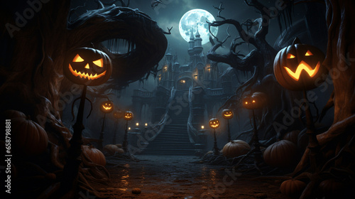 Halloween night with lanterns made of pumpkins outside of spooky castle. AI Generative