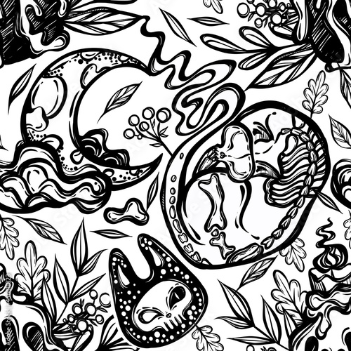 Halloween vector composition with mystical cat skeleton, candle and moon, background light, seamless pattern, t-shirt design