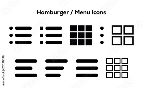 Hamburger Menu Icon Vector Set, Flat UI Navigation Symbols Collection, Grid and Dot Menu Icons, Minimal Interface Menu Button Graphics, Mobile App Navigation Icons, Menu Symbols, Hamburger Menu Symbol