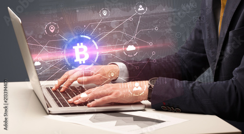Hand checking on laptop global bitcoin exchange rate concept