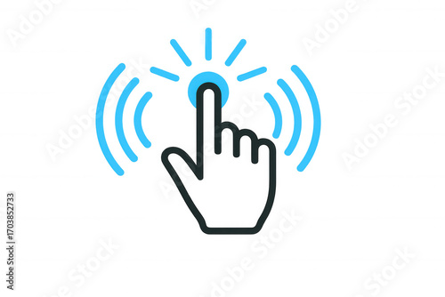 Hand cursor hovering over translucent digital button, generating radial feedback waves representing interactive web navigation