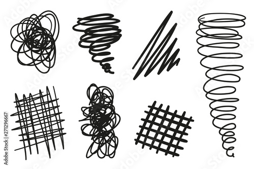 Hand drawn chaotic shapes on isolated white background. Abstract symbols. Wavy tangled backdrops. Elements for posters and flyers. Black and white illustration