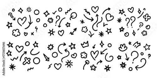 Hand Drawn Doodle Elements Set with Hearts Stars Arrows and Question Marks
