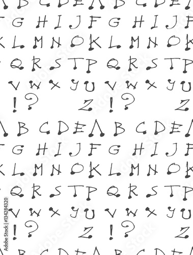 Hand drawn doodle letters and decorative elements seamless pattern. Black and white background.