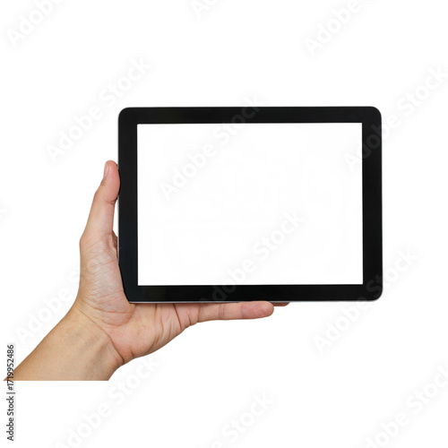 Hand holding a black tablet computer screen device for digital content viewing isolated on transparent background