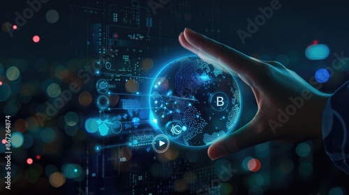 Hand Holding a Digital Globe with Bitcoin Symbol