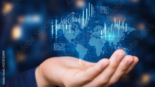Hand Holding Digital World Map with Data Analytics Graphic Displaying Global Business Overview
