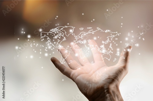 Hand holding glowing digital world map on