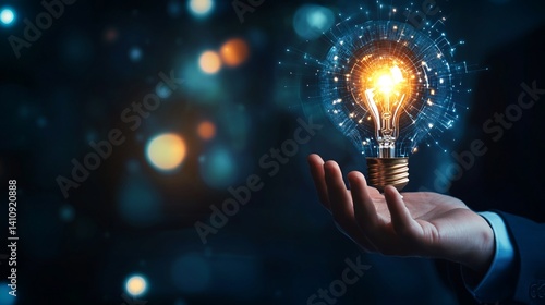 Hand Holding Illuminated Lightbulb with Digital Network Overlay