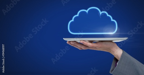 Hand holding tablet with cloud icon on blue background