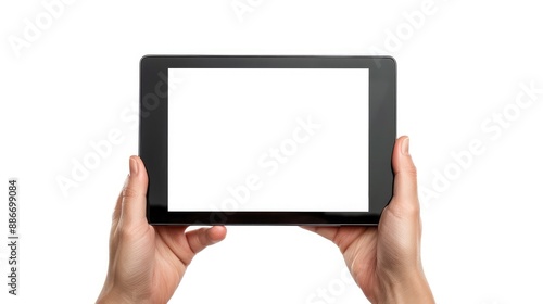 Hand holding tablet with empty screen on white backdrop