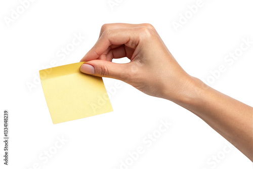 hand holding yellow sticky note, ready for writing or reminders